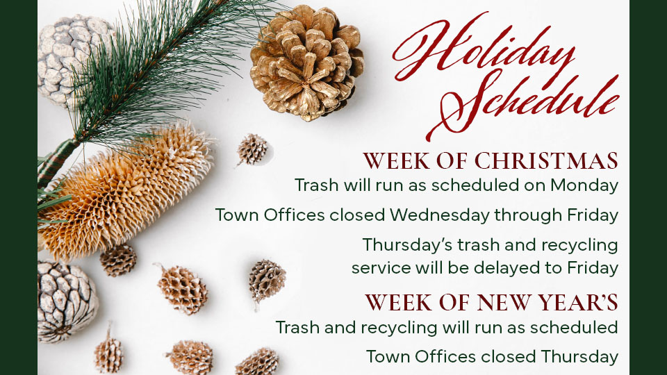 Due to the holidays, trash and recycling service will be delayed by one day. Please have your items curbside by 7:00 a.m. on Friday, December 26. You can find schedule information online or via the CWD app.